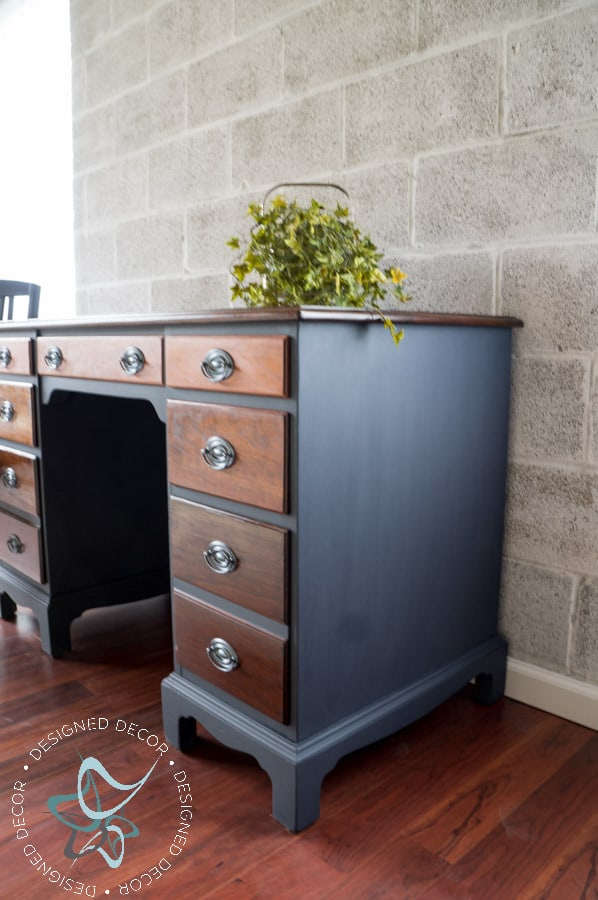 I painted the base of the desk with General Finishes Milk paint in Queenstown Gray, sealed with High-Performance flat, and finished with glaze effects in pitch black.