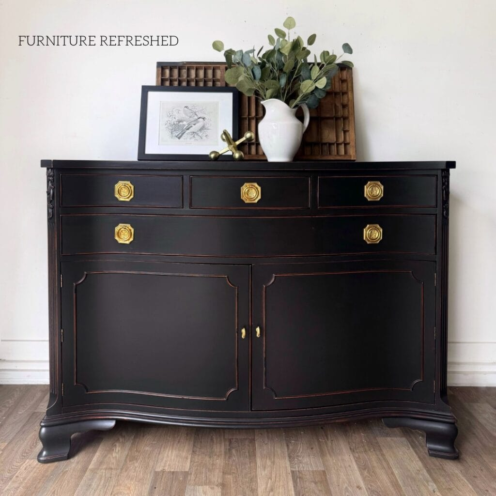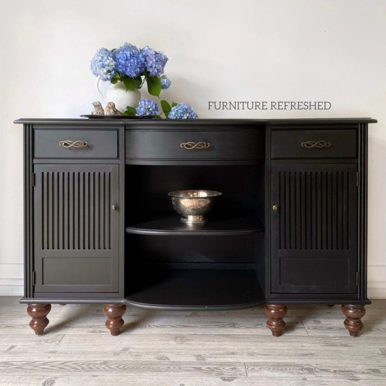 I started this post of buffets with one painted in black, so it seems only fitting to end with another Jett Black beauty. A truly timeless color for buffets and sideboards! This one has a more modern feel with a smooth, solid finish and turned wood feet.