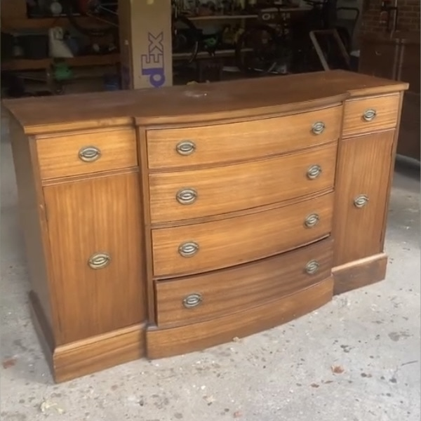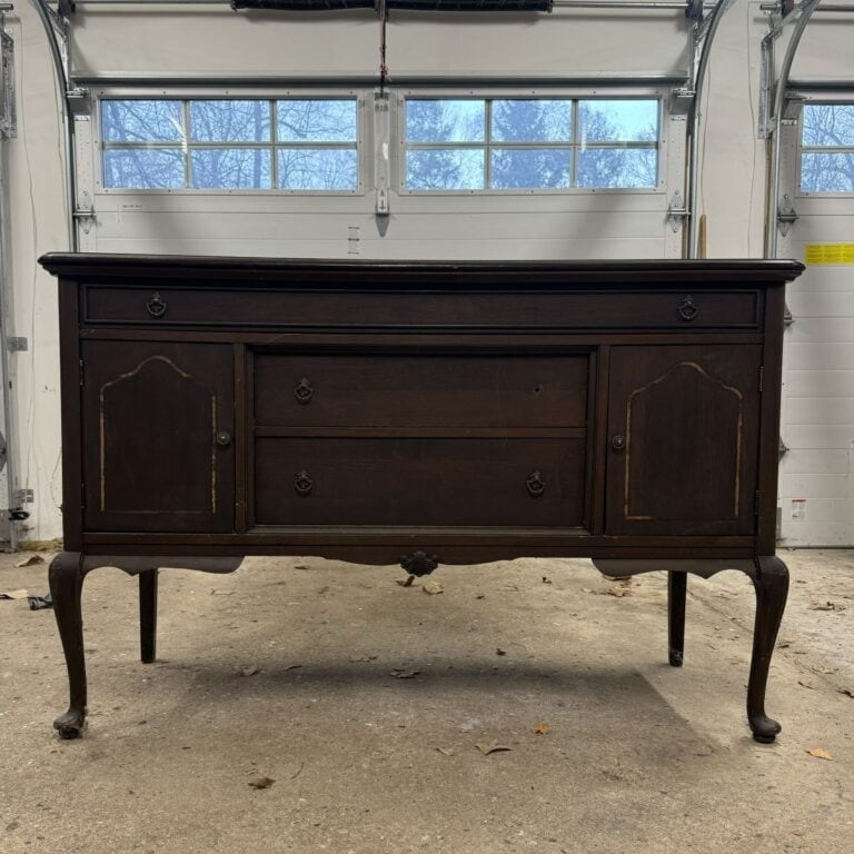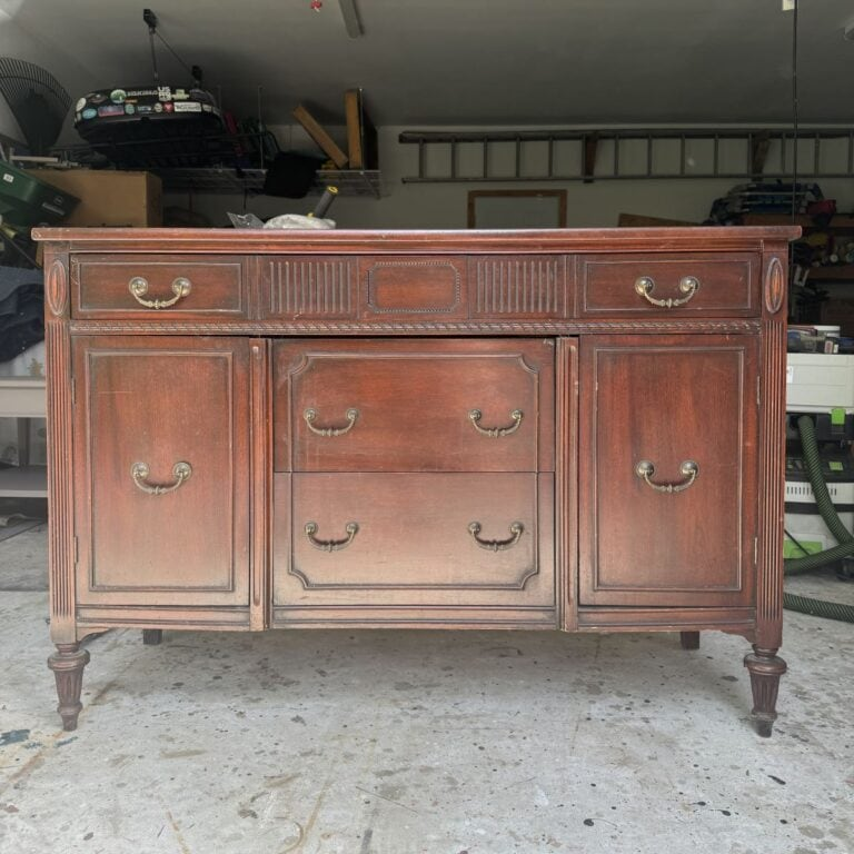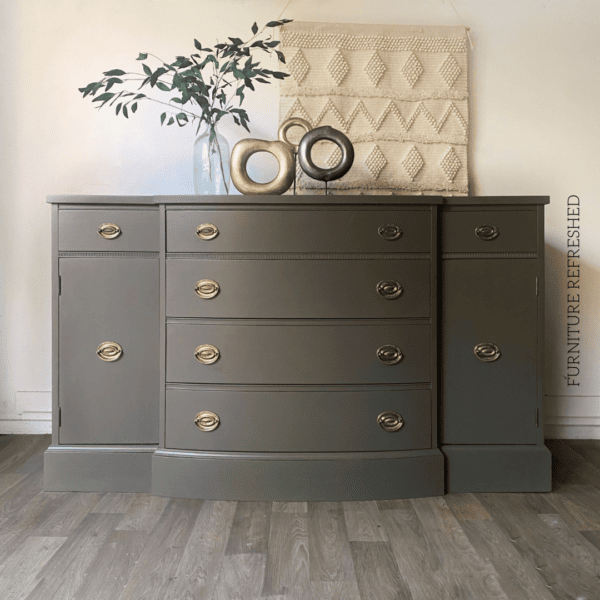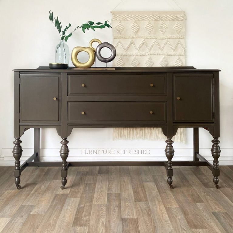 This style of sideboard maximizes storage with lots of drawers and two tall cabinets. Painted in the color Restoration Bronze by Melange Paints, a moody neutral with brown and green undertones, you can get the rest of the makeover details here.