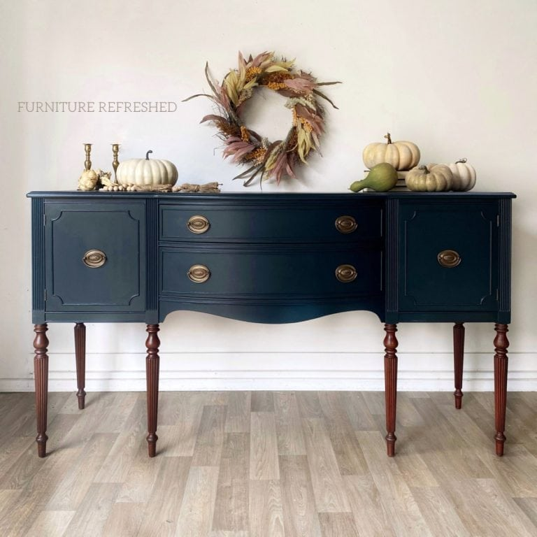 This style of sideboard, with Hepplewhite hardware and long legs, is my all-time favorite! Such a classic style and they look great in so many colors with the wood legs to contrast. Painted in the color Carbon by Melange Paints, sadly, a discontinued dark teal color.
