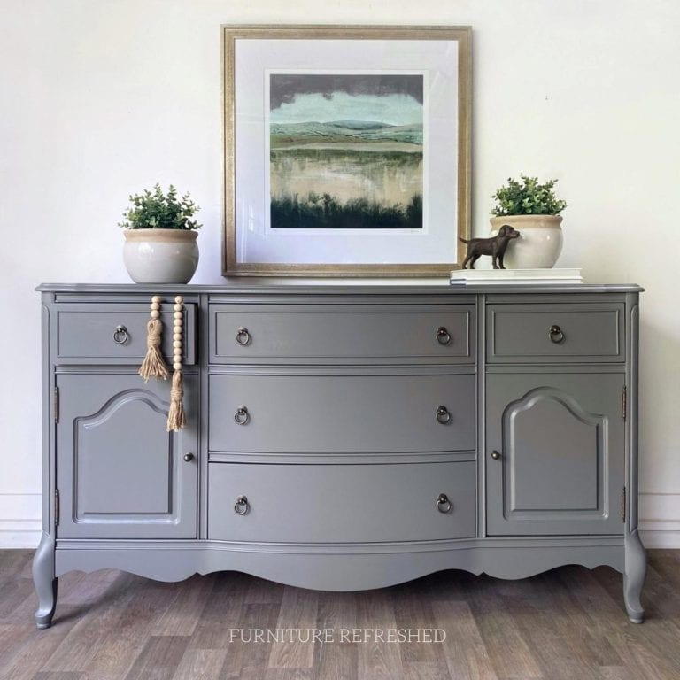 French Provincal furniture looks beautiful in so many colors and this buffet is no exception! Painted in Renegade Gray by Melange paints. This color has been discontinued, but it lands in between Cinder Gray and Hurricane Gray.
