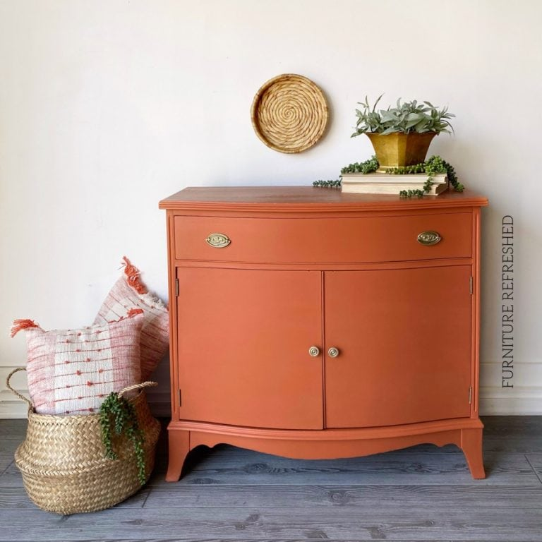 An oldie but goodie! One of my older furniture makovers is still sitting in our guest room and is the perfect accent to the rest of the neutral and navy decor. Painted in a mixture of Copperhead Orange (discontinued) and Perfect White, both by Melange Paints.
